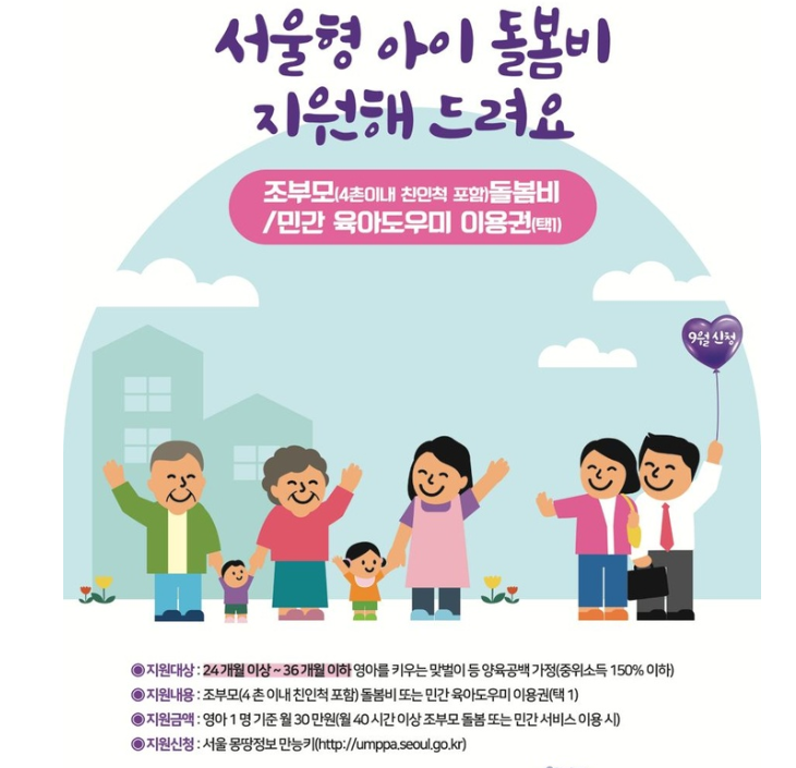 서울시는 조부모 등 가족 돌봄을 공식 수당으로 지급하지는 않았지만, 가정 내 돌봄 부담을 줄이기 위한 보육료·아이돌봄 서비스 지원 비율을 확대했습니다.